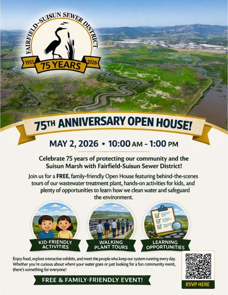 Celebrate 75 years of protecting our community and the Suisun Marsh with Fairfield-Suisun Sewer District! Join us for a free, family-friendly Open House featuring behind-the-scenes tours of our wastewater treatment plant, hands-on activities for kids, and plenty of opportunities to learn how we clean water and safeguard the environment. Explore interactive exhibits and meet the people who keep our system running every day. Free food will be available for people who pre-register through Eventbrite by 4/24/26.